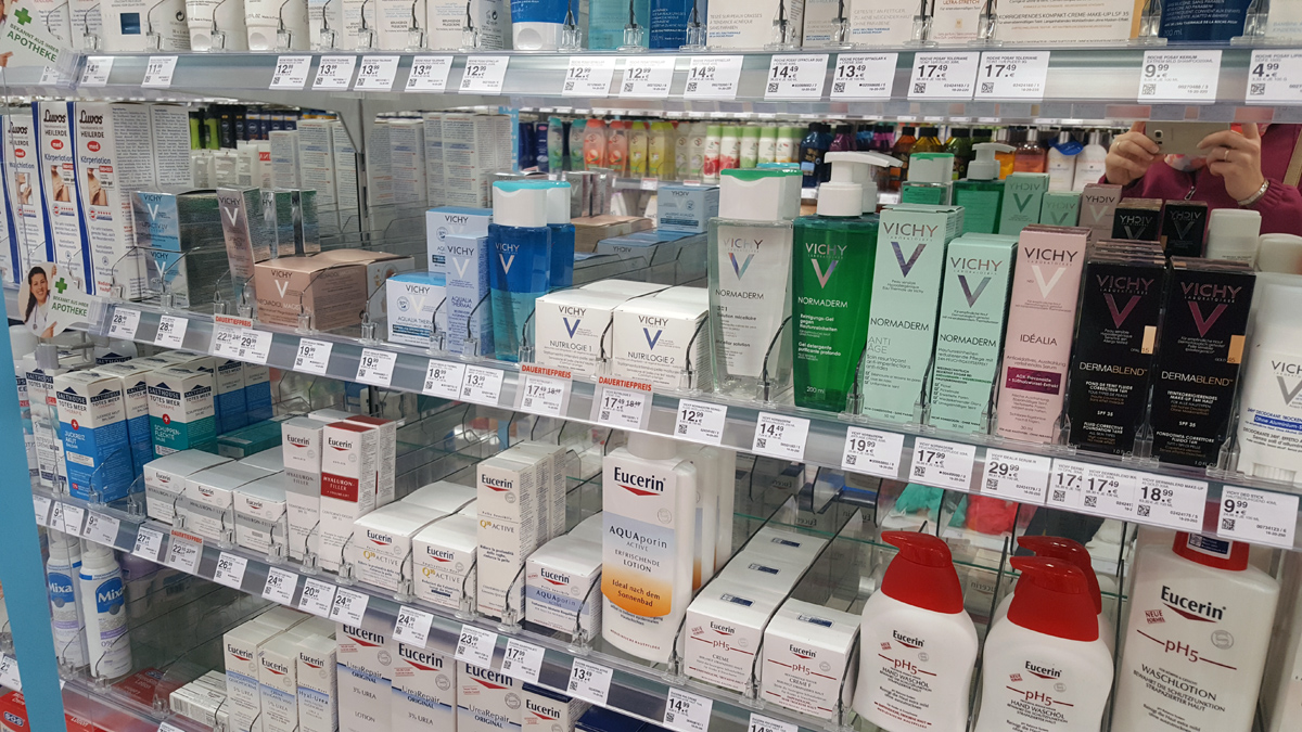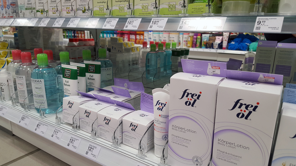 Im Hautpflege-Regal werden unter dem Stichwort „Medizinische Pflege“ zahlreiche Marken aus der Offizin präsentiert, die laut Herstellerangaben apothekenexklusiv vertrieben werden. Foto: APOTHEKE ADHOC