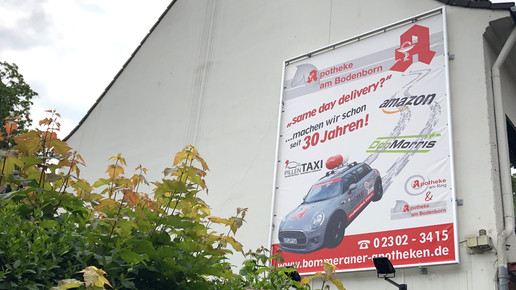 Wenn sich Onlinehändler für ihre schnelle Lieferung feiern, können Apotheker nur lachen: Die Apotheke am Bodenborn machte 2019 mit einem großflächigen Plakat auf ihr Pillentaxi aufmerksam.Foto: Apotheke am Bodenborn