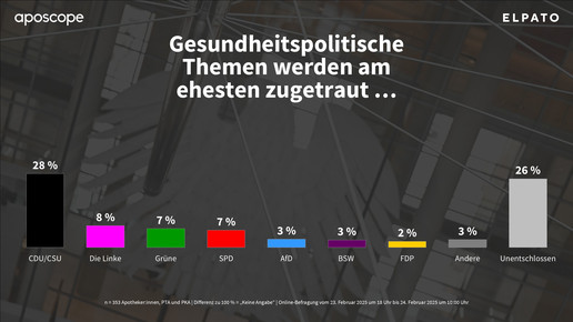 Die Union gewinnt die Bundestagswahl, die SPD wird abgestraft, die FDP fliegt aus dem Bundestag. Wie die Inhaberinnen und Inhaber sowie die Angestellten aus den Apotheken gewählt haben, zeigt eine aktuelle aposcope-Befragung. Hier haben es die Grünen auf den zweiten Rang geschafft. Von der neu zu bildenden Regierung erwarten sich die Teams nicht viel – es gibt viele dringende Themen, dass diese auch umgesetzt werden, glauben wenige der Umfrageteilnehmer:innen.