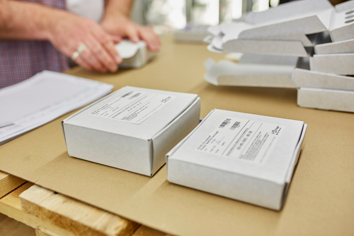 Die Fläschchen werden in die Sekundärverpackung umverpackt.Foto: Krieger