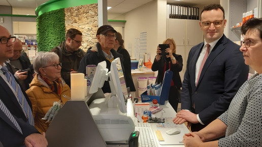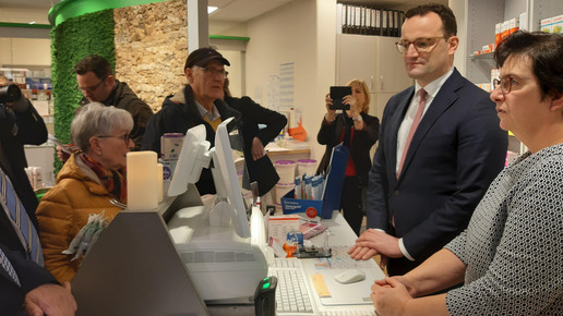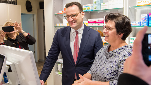 Apothekeninhaberin begrüßte ihre Kunden und den Gesundheitsminister herzlich. Foto: APOTHEKE ADHOC