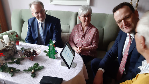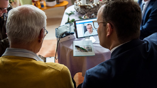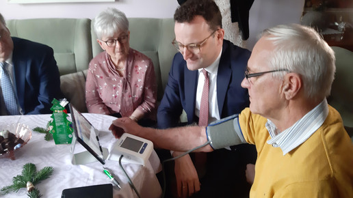 In der Wohnung von Familie Neumann aus Halle begutachtete Gesundheitsminister Jens Spahn im Rahmen eines Modellprojekts eine telemedizinische Sprechstunde. Foto: BMG/Thomas Ecke