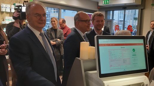 Vor den Augen von Haseloff und zahlreicher Medienvertreter wurde das ausgestellte E-Rezept in der benachbarten Niemeyer-Apotheke eingelöst.Foto: APOTHEKE ADHOC