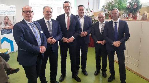Dirk Neumann, Leiter des Haendel II-Projekts der Halleschen Wohnungsgenossenschaft, lud Sachsen-Anhalts Ministerpräsident Reiner Haseloff und Spahn (v. li.) ein, um den Modellversuch vorzustellen.Foto: APOTHEKE ADHOC