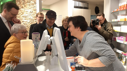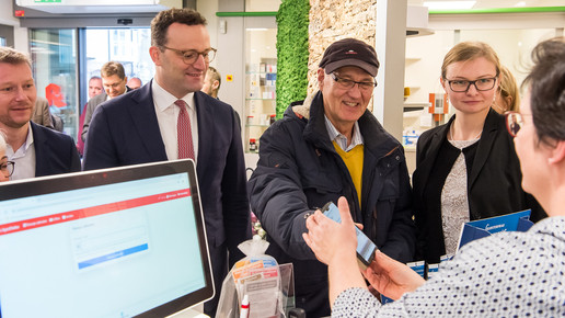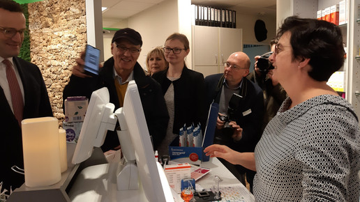 So funktioniert das also mit dem E-Rezept: Spahn lässt sich von Apothekerin Ursula Gütle das Modellprojekt Haendel II und die Einlösung eines digitalen Rezepts vorführen.Foto: BMG/Thomas Ecke