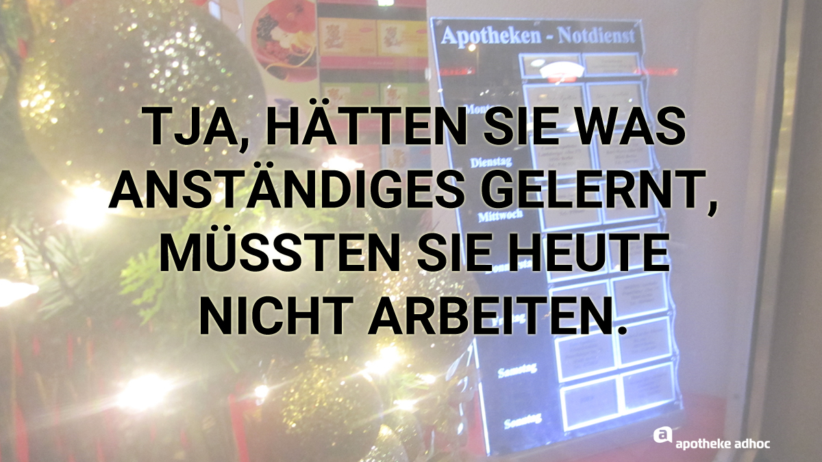 Weihnachten im Kreise der Liebsten, gutes Essen, Geschenke – und zwischendurch Notdienst schieben. Was gibt es Schöneres? Besonders stimmungsvoll wird es, wenn die Kunden dann auch noch mit speziellen Ansprüchen kommen, einen frechen Spruch drücken oder unbeholfene Witze reißen. Wenn Ihnen so etwas im Weihnachtsnotdienst widerfährt, hier die tröstende Botschaft: Es ging anderen auch schon so.