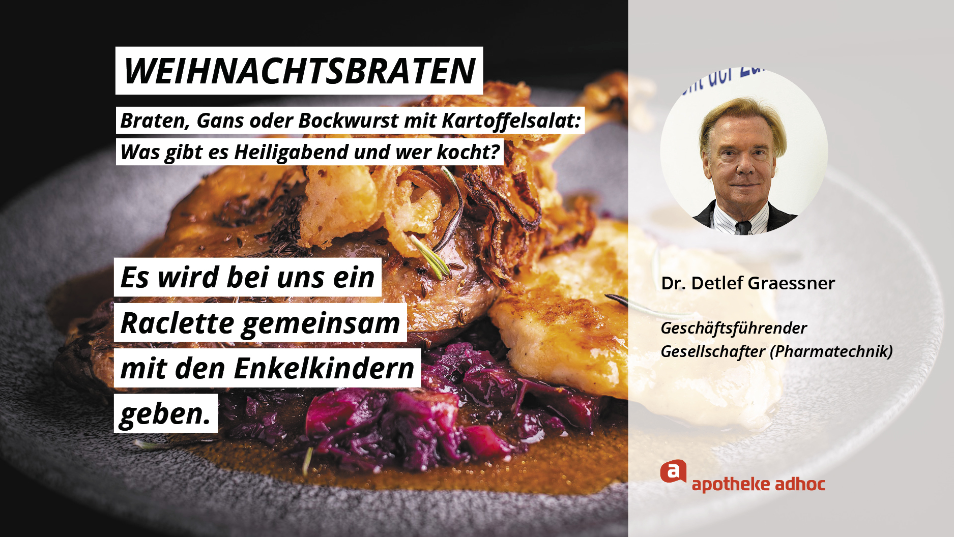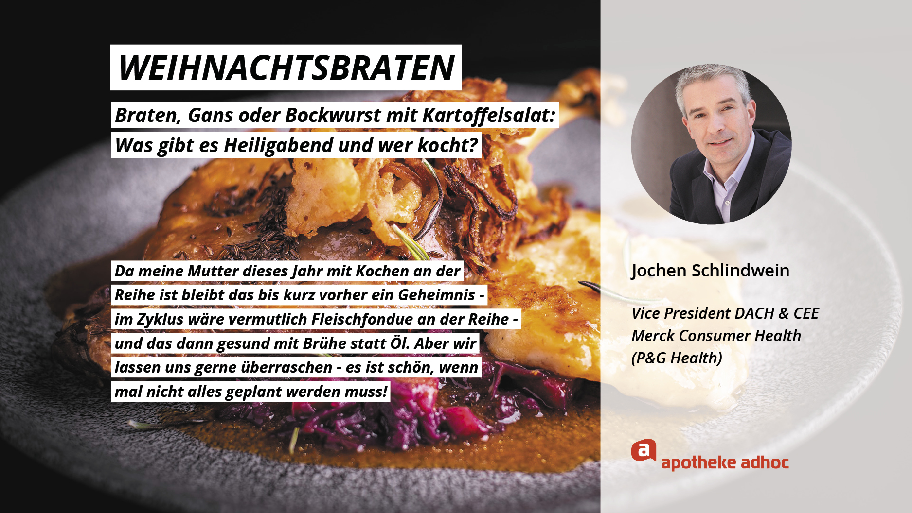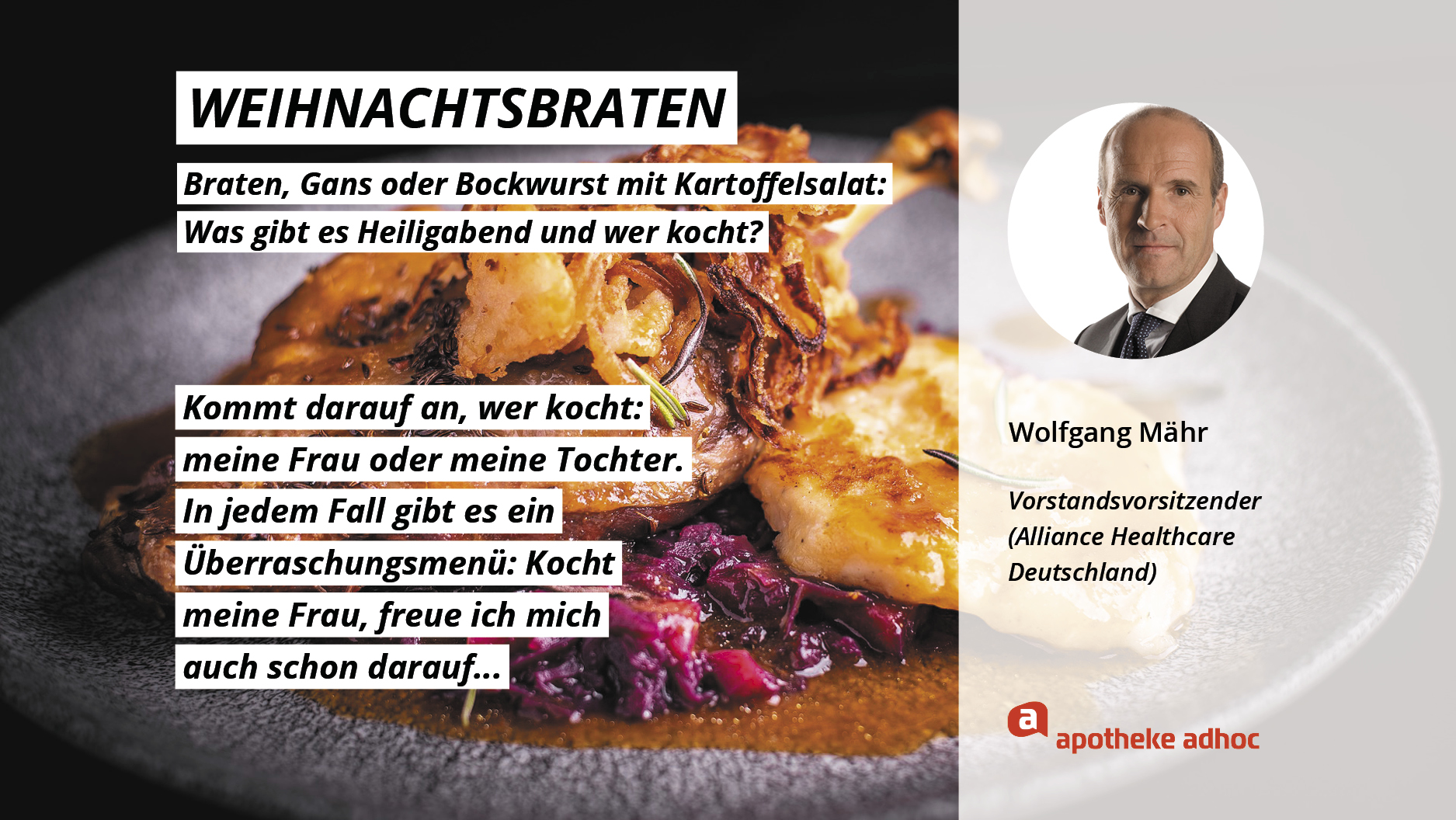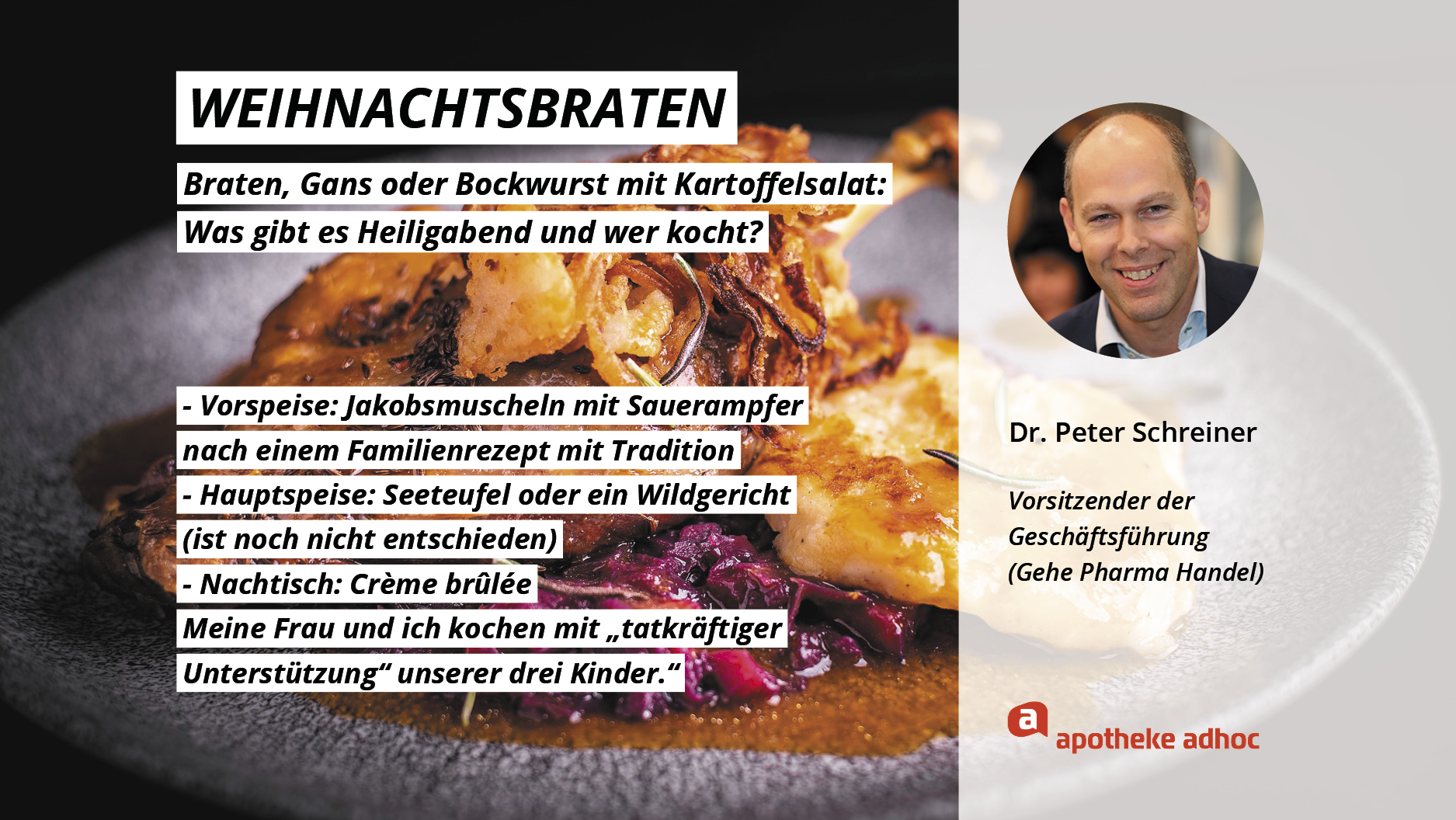 Weihnachten ist das Fest der Liebe – und der Weihnachtsmenüs. Hier verraten die Pharma-Promis, was bei ihnen Heiligabend auf den Tisch kommt und wer bei ihnen in der Küche steht.