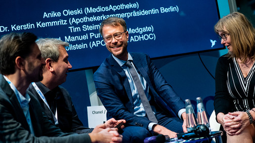 Tim Steimle, Chef-Apotheker bei der TK, diskutierte beim APOTHEKE ADHOC Talk im Rahmen der Medizinmesse Xpomet mit Dr. Kerstin Kemmritz (Apothekerkammer Berlin), Anike Oleski (Medios-Apotheken Berlin) und Dr. Manuel Puntschuh (Medgate) über die Zukunft der Apotheke.Foto: Andreas Domma