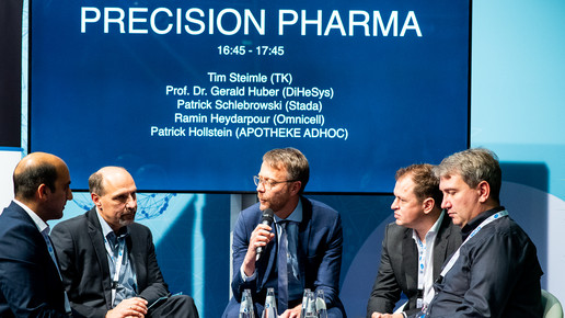 Beim APOTHEKE ADHOC Talk im Rahmen der Medizinmesse Xpomet diskutierten Professor Dr. Gerald Huber (DiHeSys), Patrick Schlebrowski (Stada), Tim Steimle (TK) und Ramin Heydarpour (Omnicell) über das Thema Precision Pharma.Foto: Andreas Domma