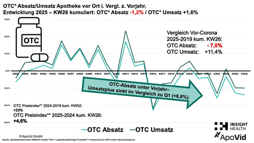 Auch das OTC-Geschäft drehte wegen des zweiten Quartals ins Minus, jedenfalls nach Absatz: Die Anzahl der verkauften Packungen lag bis KW 26 insgesamt 1,2 Prozent niedriger als im Vorjahr; im ersten Quartal hatte es hier noch ein Plus von 4,3 Prozent gegeben. Aber seit April sind auch hier deutlich Rückgänge zu verzeichnen.