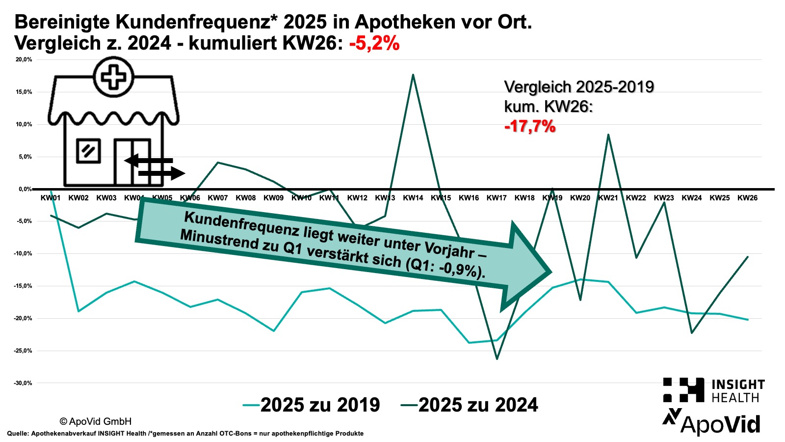 Nach einem leichten Plus zum Jahresbeginn ist der Apothekenmarkt im zweiten Quartal ins Minus gedreht. Sowohl die Kundenfrequenz als auch die OTC-Verkäufe sind dadurch im ersten Halbjahr rückläufig gewesen, wie eine Auswertung der Zahlen von Insight Health durch Apovid zeigt. Und: Erstmals wurden weniger Rx-Packungen abgegeben.