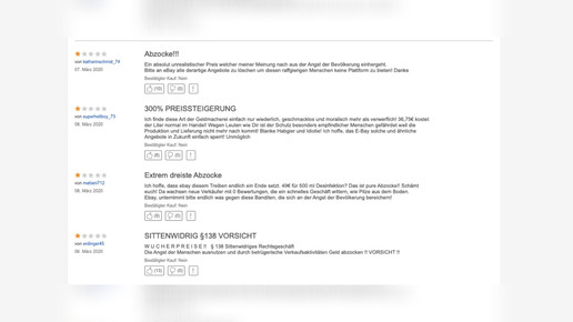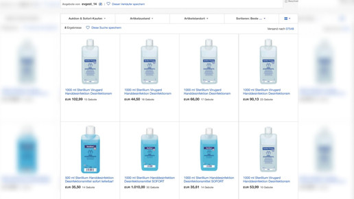 Die Startpreise für Desinfektionsmittel scheinen zunächst recht harmlos und gar billig: Für einen Euro stellte der User hygisale24 die Sterillium virugard Flasche mit 1000 ml online. Insgesamt fünf Tage soll die Auktion laufen. Bereits nach einer halben Stunde stieg der Preis auf 5,51 Euro. Nur 15 Minuten später verdoppelt ein anderer Bieter den Preis. Nach fünf Stunden liegt der Preis für das Desinfektionsmittel bei 58 Euro – dennoch gehört dieser Preis noch zu den Günstigeren. Zwei weitere Flaschen mit ähnlicher Gebotslage gehören zum derzeitigen Sortiment des Online-Verkäufers.