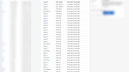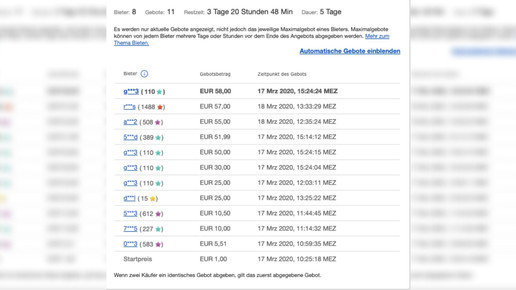 Ein anderes Gebot für 1000 ml Sterillium classic Handdesinfektion lag bei 1010 Euro. Mit einer Gebotslaufzeit von drei Tagen und einem Preis von 5 Euro startete die Auktion. Auf das Produkt wurden 30 Gebote von 10 unterschiedlichen Bietern abgegeben. Anfangs wurden die Preise lediglich um 1 bis 3 Euro überboten. Zuletzt ging es mit 100 bis 500 Euro Schritten zum endgültigen Preis. Die Auktion ist mittlerweile nicht mehr gelistet. Dennoch findet man bei dem User efis-handel weitere Auktionen um Desinfektionslösungen, mit Preisen weit über der UVP.