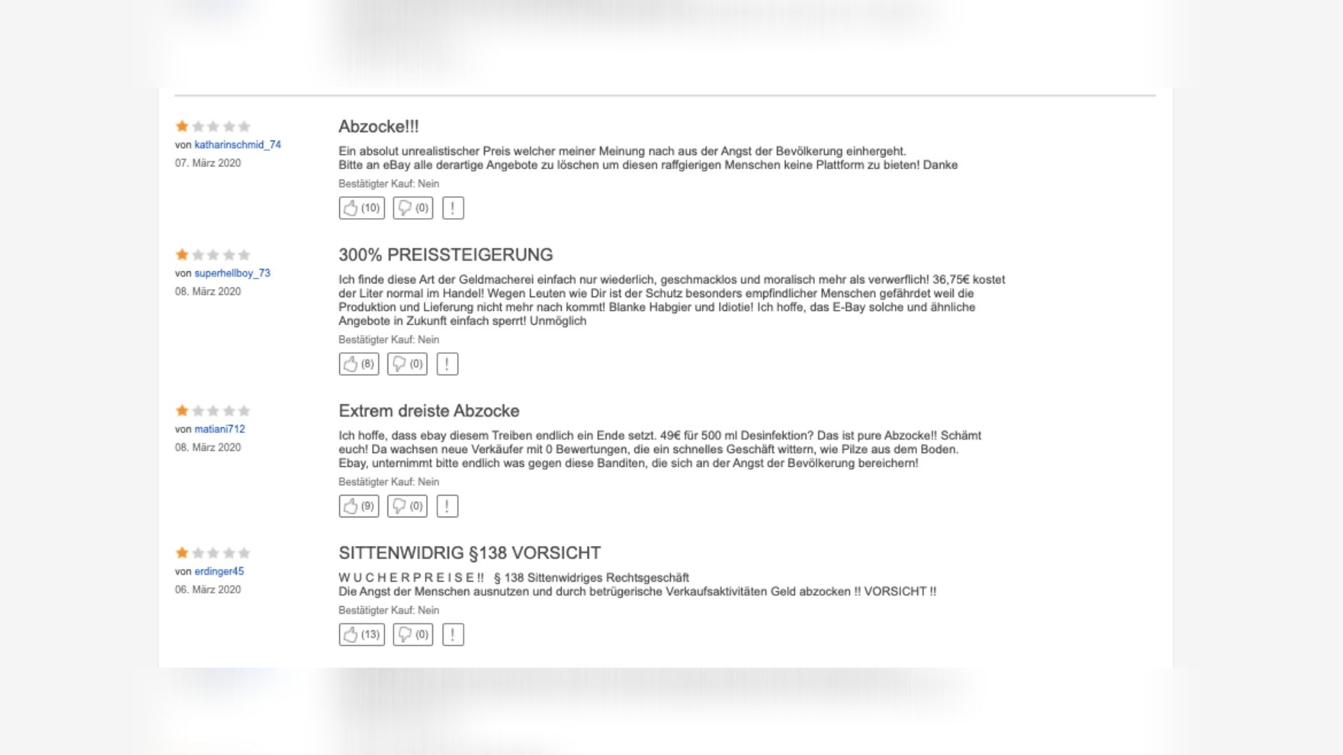 Anders als auf der US-Website von Ebay wurde der Verkauf von Atemschutzmasken, Handdesinfektion und anderen antibakteriellen Reinigungsprodukten auf der deutschen Seite nicht verboten. „Die derzeitige Situation erfordert teilweise sehr kurzfristige Anpassungen und so können wir keine Aussage zu geplanten Änderungen machen. Allgemein möchten wir aber darauf hinweisen, dass sich die regulatorische Situation in den USA maßgeblich von der in Deutschland unterscheidet. Ein wichtiger Punkt ist, dass bestimmte Desinfektionsmittel wie zum Beispiel Sterillium in Deutschland nicht von privaten Käufern verkauft werden dürfen. Insoweit gibt es also bereits ein gesetzliches Verbot, welches Verkäufer natürlich beachten müssen und welches von uns auch durch umfangreiche Blockierung und Löschung von Angeboten durchgesetzt wird“, so eine Sprecherin.