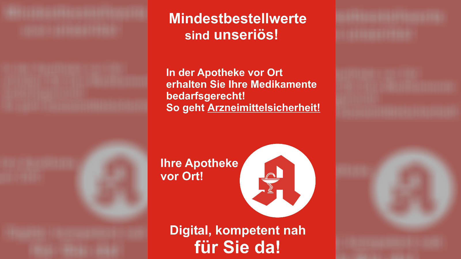 Apotheker Dr. Christian Gerninghaus hat mal wieder seine digitale Sichtwahl umgestaltet: Statt Angebote oder Informationen zu OTC-Arzneimitteln lesen die Kunden jetzt zum Beispiel: „Mindestbestellwerte sind unseriös! In der Apotheke vor Ort erhalten Sie Ihre Medikamente bedarfsgerecht! So geht Arzneimittelsicherheit!“ Die Motive stellt er den Kollegen zur Verfügung. Das Motto auf allen Bildern: „Digital, kompetent, nah für Sie da!“