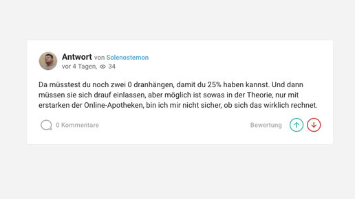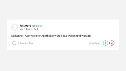 „Kann ich zur Apotheke gehen und Geld anbieten um an Gewinn beteiligt werden zu können? Ich will meiner Apotheke 20.000 Euro anbieten und will 1/4 vom Gewinn haben. Kann ich mit Apothekeninhaber so einen Vertrag anbieten?“ wollte kürzlich „MentholMan“ von der Community wissen. „Da müsstest du noch zwei 0 dranhängen, damit du 25 Prozent haben kannst. Und dann müssen sie sich drauf einlassen, aber möglich ist sowas in der Theorie, nur mit erstarken der Online-Apotheken, bin ich mir nicht sicher, ob sich das wirklich rechnet“, schlägt Solenostemon vor.