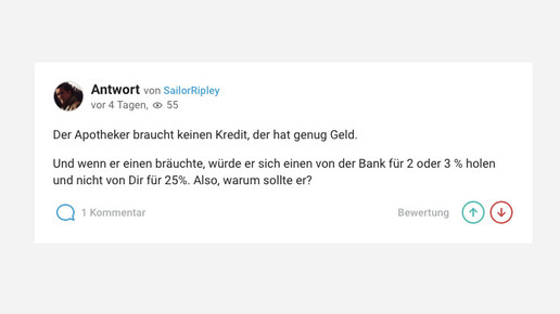 Keine Chancen räumt pblaw diesen Anliegen ein: das sei zwar möglich, „aber welcher Apotheker würde das wollen und warum?“ Mit einer Gegenfrage reagiert Gustavolo: „Nehmen wir einmal an, der Apotheker würde ausnahmsweise dein 20.000 Euro-Angebot annehmen, mit welchem Gewinn in Euro kalkulierst du?“ Und SailorRipley meint: „Der Apotheker braucht keinen Kredit, der hat genug Geld.“ Und wenn er doch einen bräuchte, würde er sich einen von der Bank für 2 oder 3 Prozent holen und „nicht von Dir für 25 Prozent“. „Also, warum sollte er?“ „Die rufen höchstens einen Arzt“, stellt archibaldesel zum Abschluss der kurzen Debatte fest.