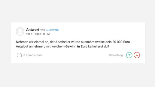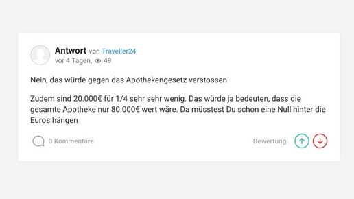 „Nein, das würde gegen das Apothekengesetz verstoßen“, antwortete Traveller24. Zudem seien 20.000 Euro für 1/4 einer Apotheke „sehr sehr wenig“. Das würde laut Traveller24 bedeuten, dass die gesamte Apotheke nur 80.000 Euro wert wäre: „Da müsstest Du schon eine Null hinter die Euros hängen.“