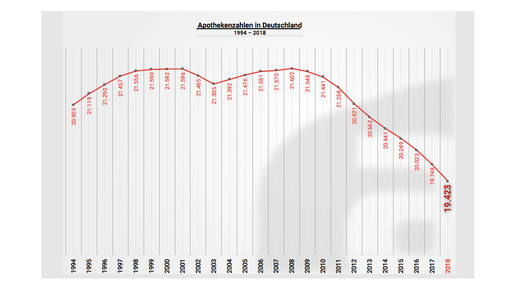 Jetzt ist es amtlich: Zum Jahresende 2018 gab es laut ABDA 19.423 öffentliche Apotheken, 325 weniger als im Jahr zuvor. Noch nie haben netto so viele Apotheken aufgegeben, der Rückgang entspricht einem Minus von 1,6 Prozent. Die Zahl der Apothekenleiter ist unter 15.000 gefallen.