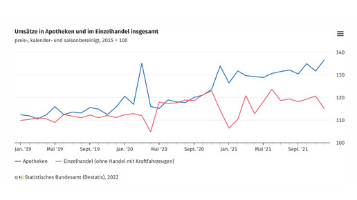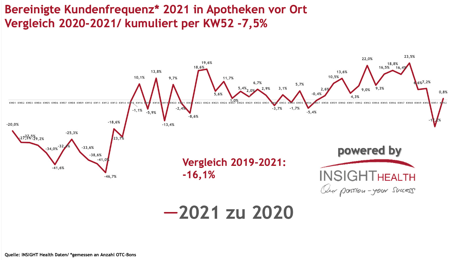 Das Jahr 2021 war gekennzeichnet durch einen massiven Einbruch in den ersten Monaten, eine Aufholjagd im Frühsommer und einen starken Schlussspurt. Weil schon 2020 aufgrund von Corona geprägt war durch starke Schwankungen – Hamsterkäufe im März, Einbruch danach und fehlender Erkältungssaison im Herbst – waren auch die Zahlen im vergangenen Jahr extrem volatil: Lag die Kundenfrequenz zunächst bis zu 47 Prozent unter Vorjahr (KW 12), konnten in der Spitze Zuwächse von bis zu 24 Prozent verbucht werden (KW 48).