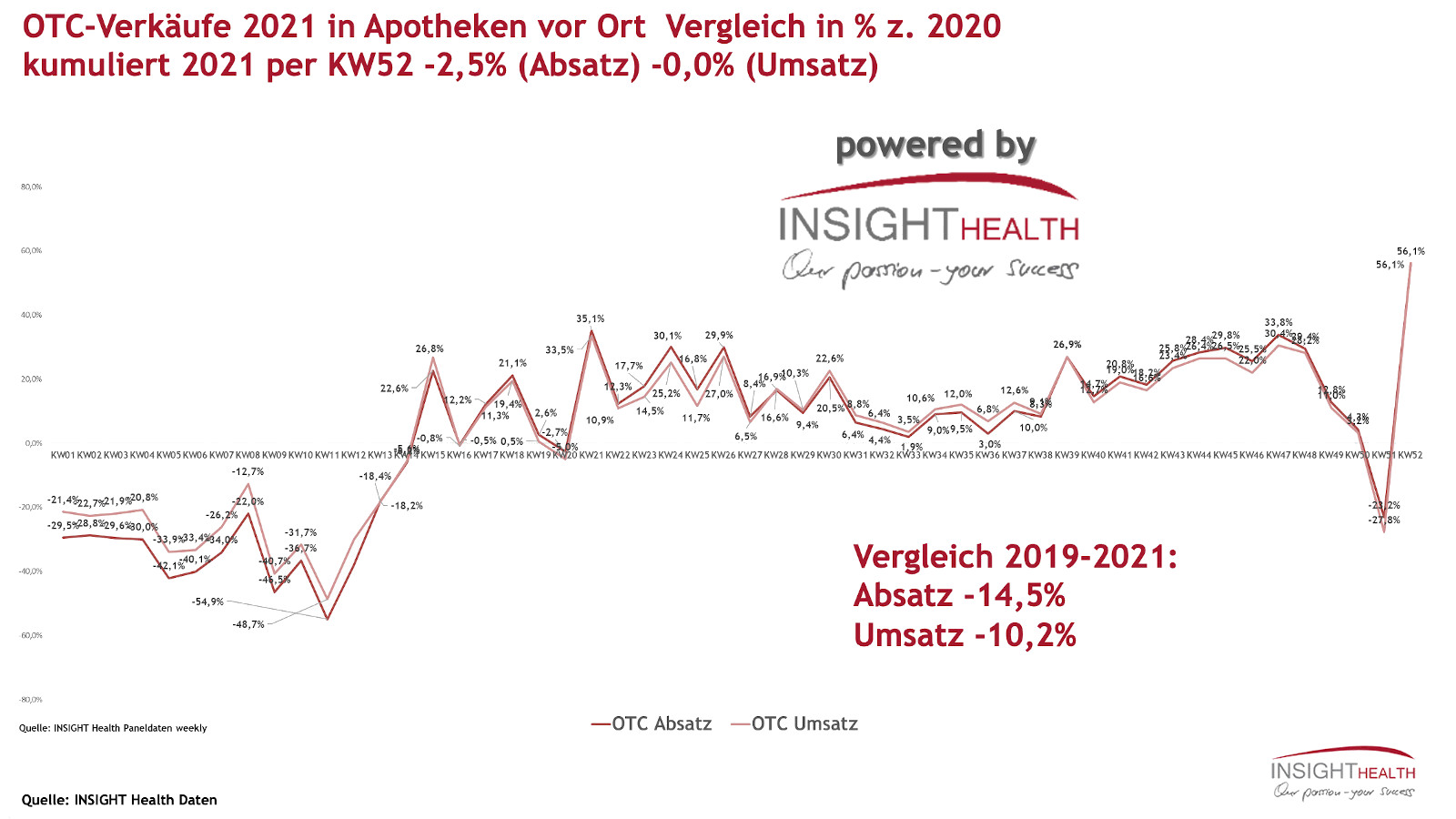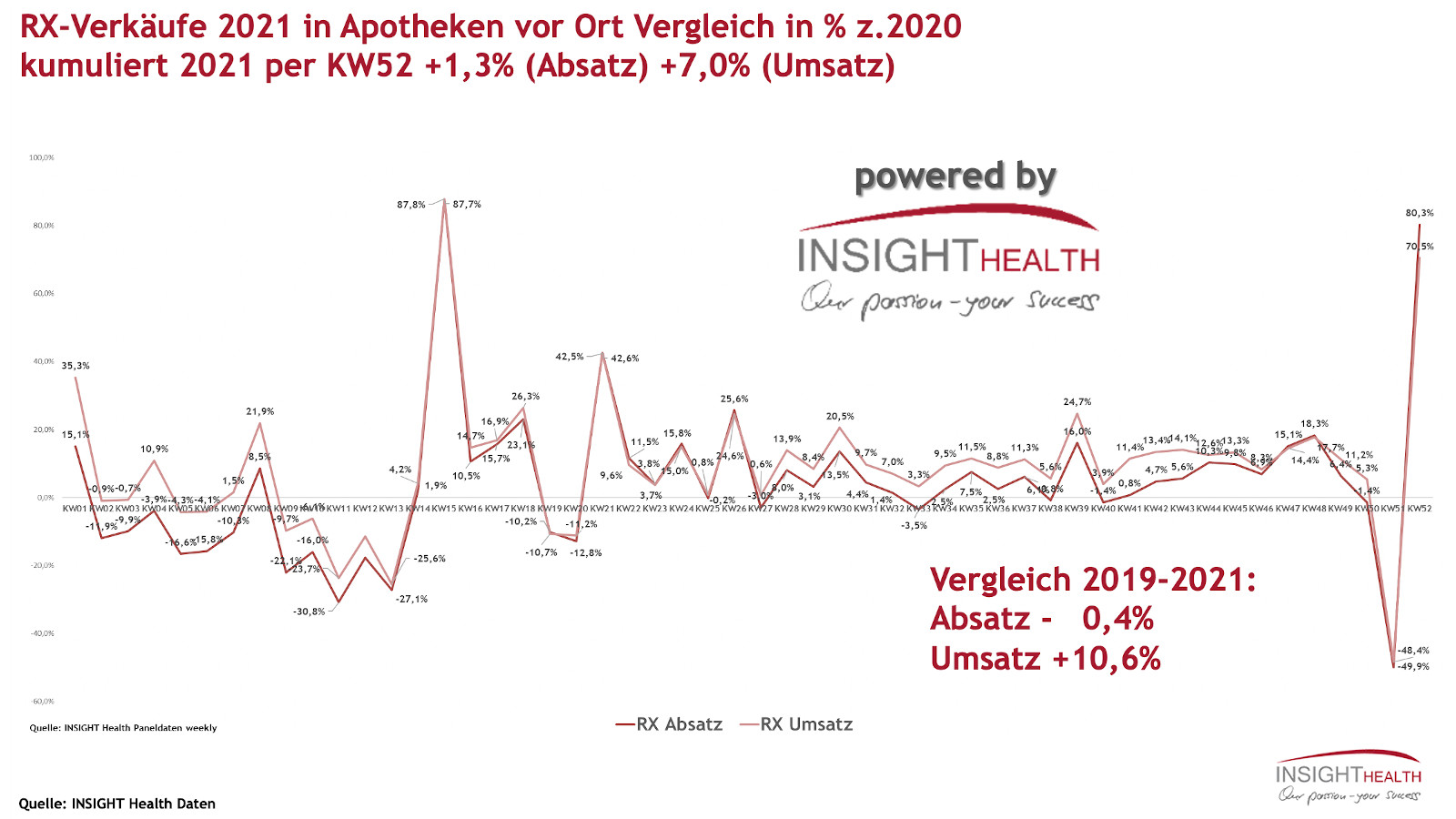 Über das Gesamtjahr hinweg besuchten 7,5 Prozent weniger Kund:innen die Apotheken; Insight Health errechnet die Kundenfrequenz aus der Anzahl der OTC-Bons. Die Abverkäufe im nicht verschreibungspflichtigen Bereich lagen nach Packungen 2,5 Prozent unter Vorjahr und nach Umsatz auf Vorjahresniveau. Nur der Rx-Bereich lag über Vorjahr, und zwar sowohl nach Absatz (plus 1,3 Prozent) als auch nach Umsatz (plus 7 Prozent). Allerdings ist bei den Daten in Euro zu berücksichtigen, dass die Mehrwertsteuer im vorangegangenen Jahr teilweise auf 16 Prozent gesenkt war. Teilweise gab es drastische Ausschläge von 88 Prozent (KW 15, Ostern und Lockdown) und 80 Prozent (KW 52, Weihnachten).