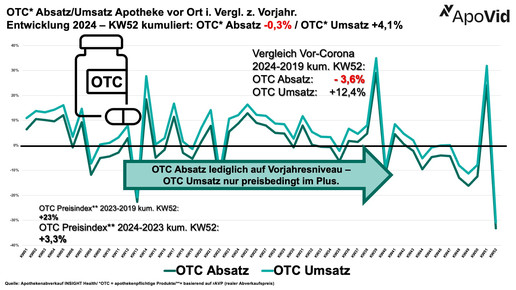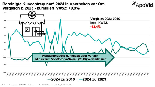 2024 war kein gutes Jahr für die Apotheken. Auf einen mittelmäßigen Verlauf folgte ein schwacher Abschluss: Seit Oktober lag die Kundenfrequenz deutlich unter Vorjahr; unter dem Strich lagen die OTC-Abverkäufe nur auf Vorjahresniveau, wie eine Analyse der Zahlen von Insight Health durch Apovid zeigt.