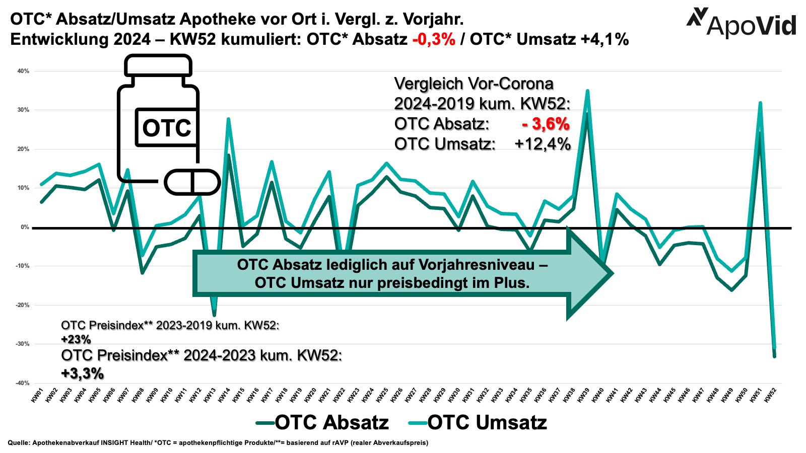 Die Anzahl der verkauften Packungen von OTC-Arzneimitteln war im Grunde genommen seit Sommer ebenfalls rückläufig. Auch hier liegen die meisten Wochen nach KW 39 unter Vorjahr. Am Ende lag der Absatz nur auf Vorjahresniveau (minus 0,3 Prozent), der Umsatz wuchs gerade einmal um 4,1 Prozent. Grund für den Unterschied ist der um 3,3 Prozent gestiegene Durchschnittspreis pro Packung.