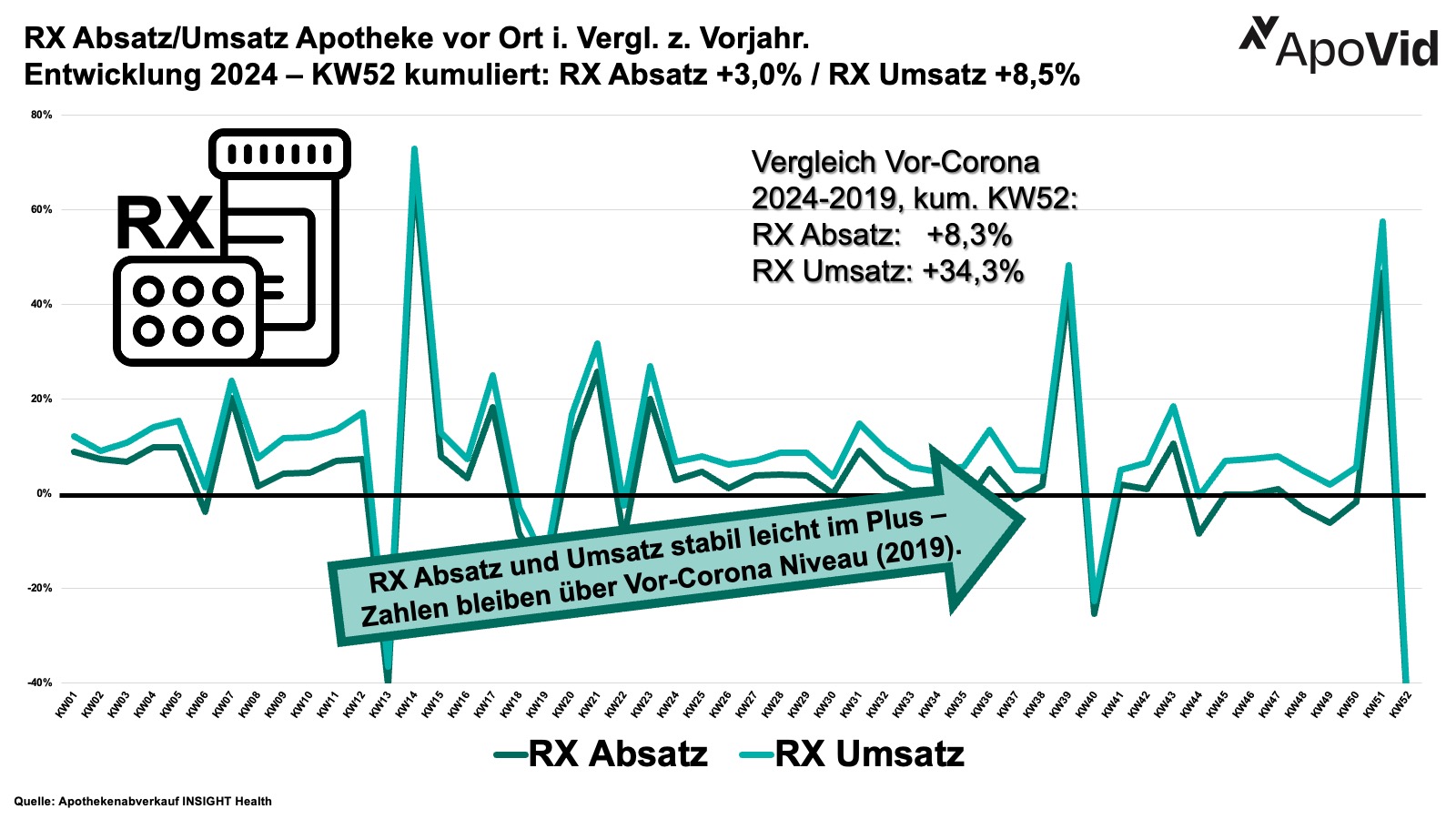 Der Absatz von Rx-Medikamenten ist mit einem Plus von 3 Prozent im Vergleich zum Vorjahr gestiegen, der Umsatz legte um 8,5 Prozent zu. Hier konnten Absatz und Umsatz im Vergleich zum Vor-Corona-Niveau gesteigert werden: Die Zahl der abgegebenen Packungen stieg hier um 8,3 Prozent, der Umsatz aufgrund der Zunahme von Hochpreisern sogar um 34,3 Prozent.