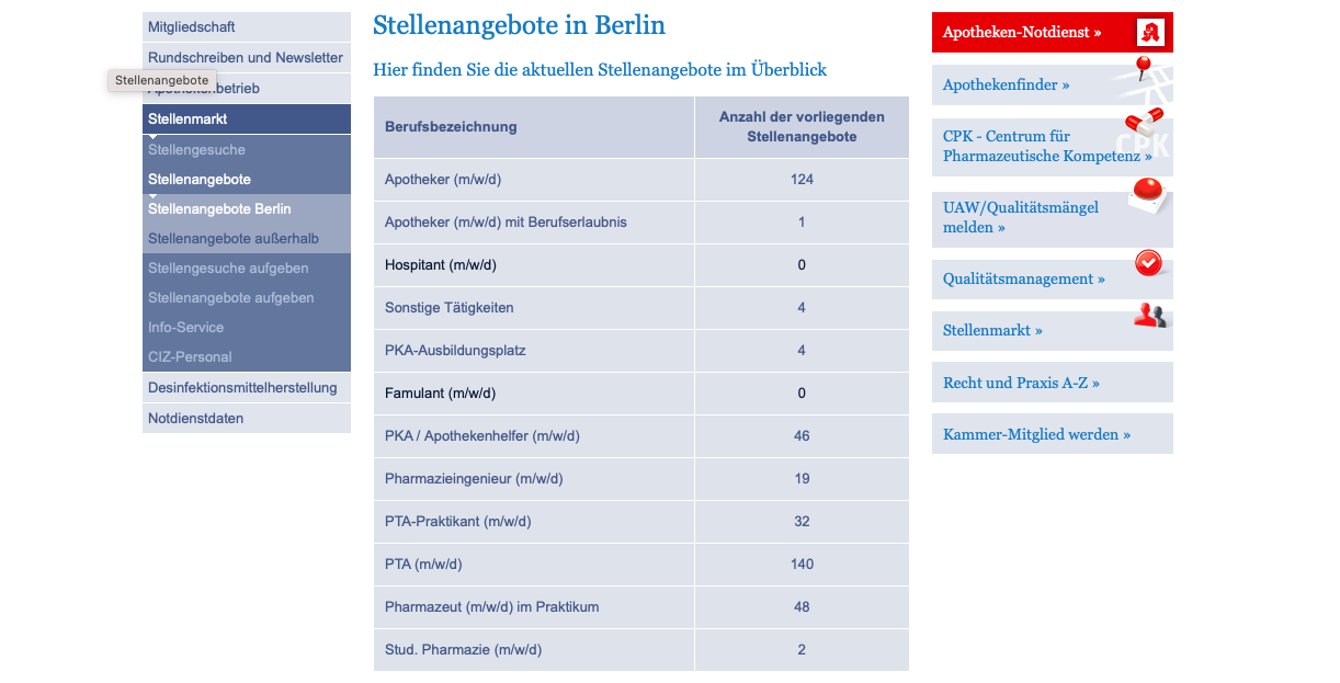 Allein bei der Apothekerkammer Berlin sind aktuell 140 Stellenanzeigen für PTA geschaltet. Rund 750 Apotheken gibt es in der Hauptstadt. Unter den Stellenanzeigen sind fast ausschließlich Angebote mit übertariflicher Bezahlung – auch nach der Tarifanpassung. Doch einige Apotheker:innen gehen noch weiter: Wechselprämie, maximale HV-Stunden oder reine Backoffice-Tätigkeit. Selbst das Angebot einer Wohnung wird gemacht. Doch die lange Liste zeigt den ausbleibenden Erfolg – viele Inhaber:innen suchen seit Monaten.