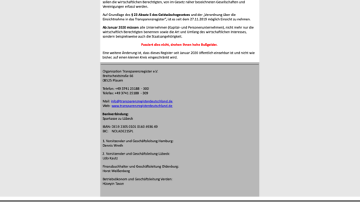 Absender des Schreibens ist ein angeblicher Verein mit dem Namen „Organisation Transparenzregister“. „Leider müssen wir feststellen, dass Sie sich bis zum heutigen Tage nicht in das Transparenzregister eingetragen haben“, heißt es in dem Anschreiben. „Dies stellt eine Ordnungswidrigkeit dar. Daher fordern wir Sie auf, sich innerhalb von 10 Tagen zu registrieren.“