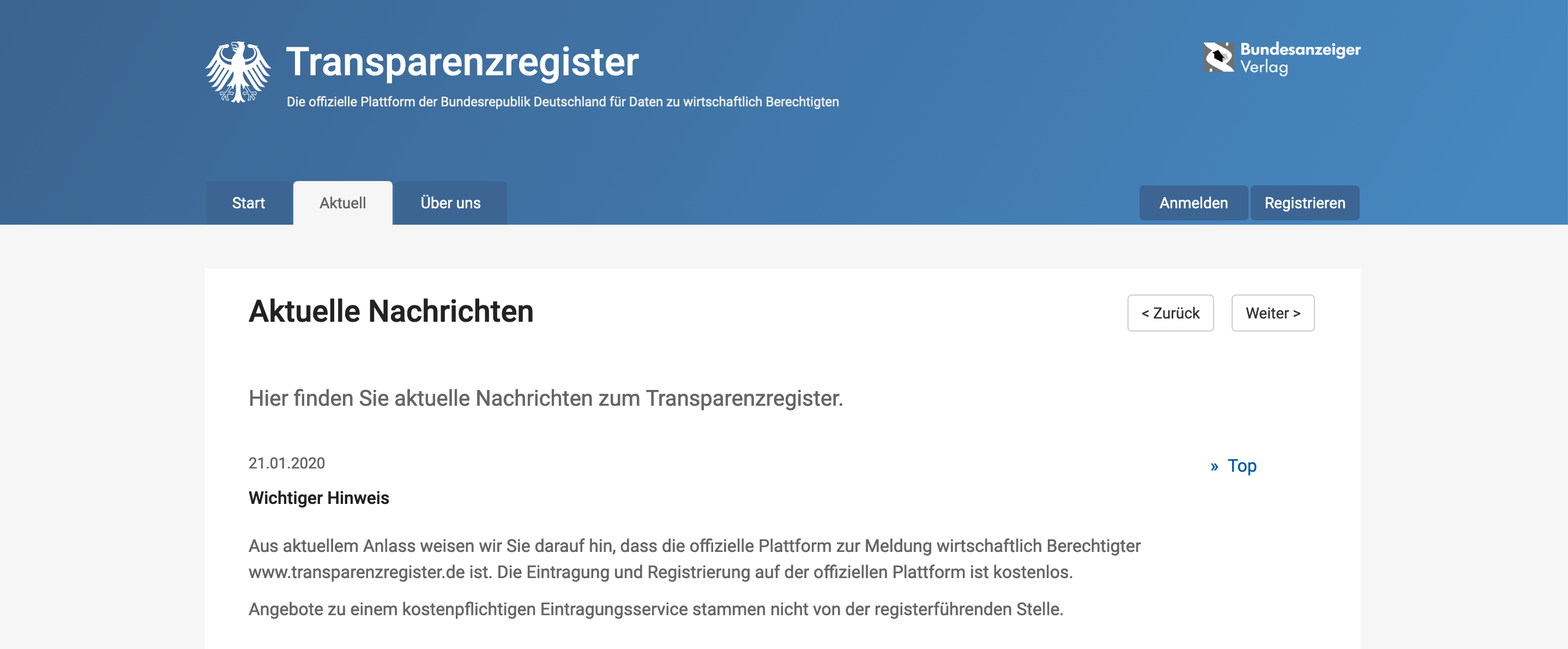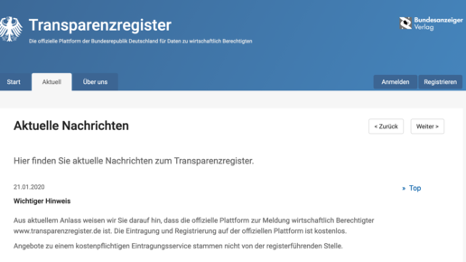 Beim Bundesanzeiger Verlag warnt man bereits vor der Masche: „Aus aktuellem Anlass weisen wir Sie darauf hin, dass die offizielle Plattform zur Meldung wirtschaftlich Berechtigter www.transparenzregister.de ist. Die Eintragung und Registrierung auf der offiziellen Plattform ist kostenlos. Angebote zu einem kostenpflichtigen Eintragungsservice stammen nicht von der registerführenden Stelle.“
