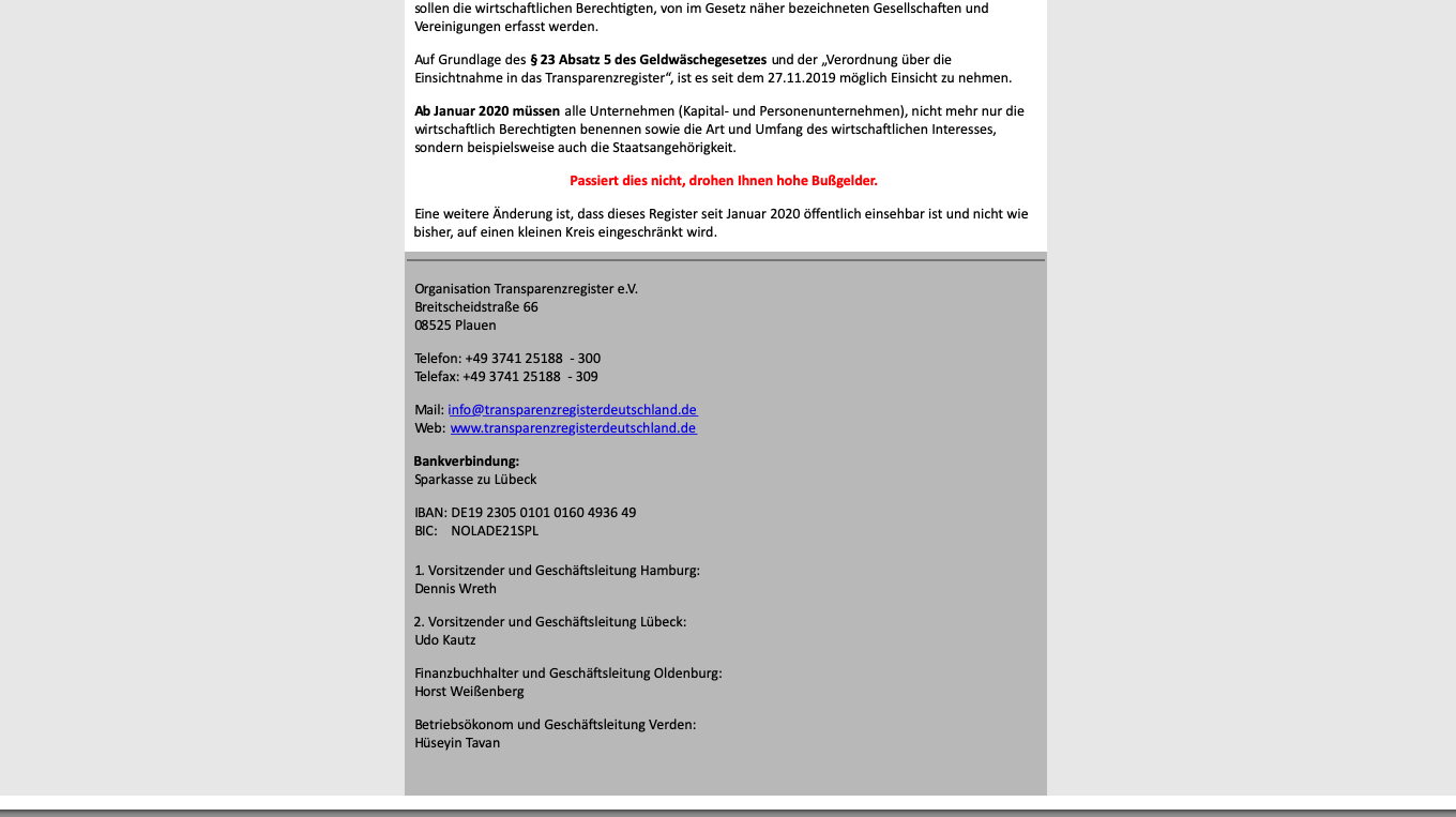 Tatsächlich gehört das Transparenzregister zum Bundesanzeiger Verlag und ist unter www.transparenzregister.de erreichbar. Den Verein gibt es nicht, auf der Website steht der Zusatz „i.G.“ – in Gründung. Unter der angegebenen Adresse in Plauen in Vogtland ist das angebliche Büro nicht zu finden, in der Mail ist außerdem ein Konto bei der Sparkasse Lübeck angegeben. In der Hansestadt sitzen auch die angeblichen Verantwortlichen des Vereins, die wiederum mit einer Reihe von Unternehmen in Verbindung stehen.