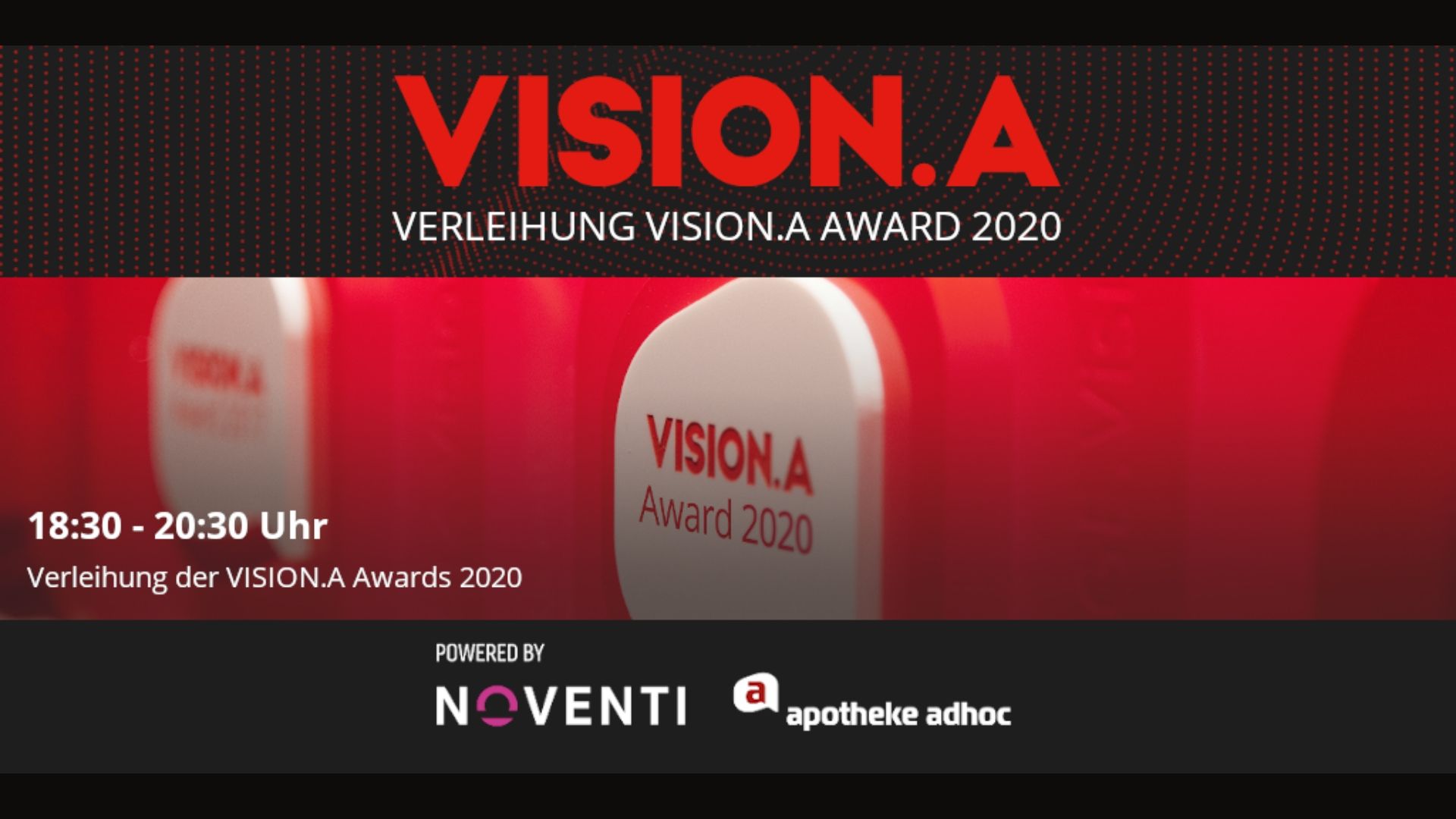 Zum fünften Mal im Rahmen der Digitalkonferenz VISION.A powered by NOVENTI und APOTHEKE ADHOC werden die begehrten VISION.A Awards verliehen. Neben neuen Kategorien gibt es in diesem Jahr erstmals das Event im Live-Stream hier auf APOTHEKE ADHOC. Mit den begehrten Awards werden Healthcare-Helden mit innovativen Konzepten und Ideen rund um den digitalisierten Pharma- und Gesundheitsmarkt ausgezeichnet. Jetzt live dabei sein!