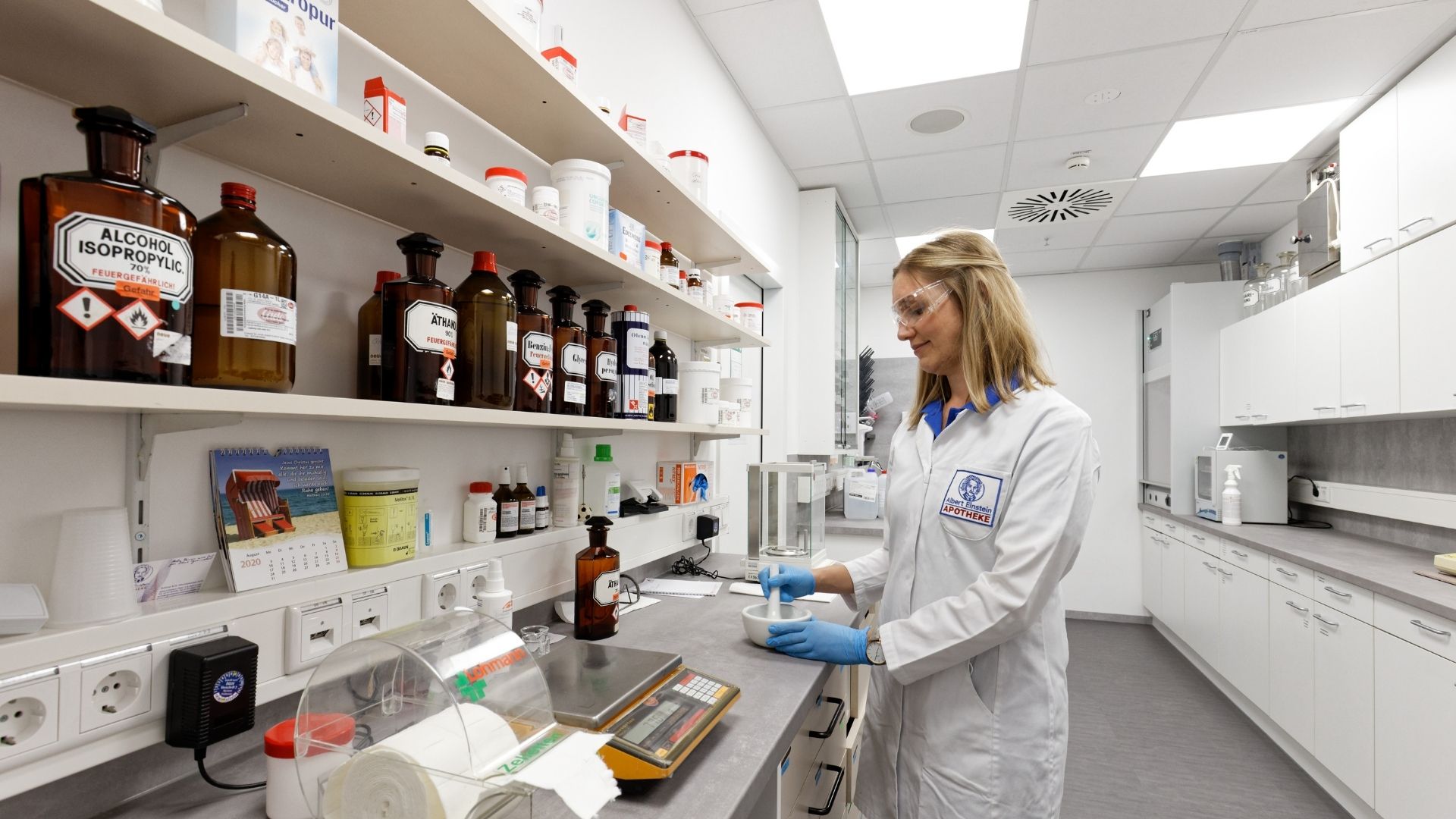 Mit diesem Plan kommen auch neue Herausforderungen auf die Apothekerin zu: „Das bedeutet, dass wir uns vergrößern. Dann brauchen wir mehr Personal und wir suchen jetzt schon.“ Ab Oktober beginnt eine PTA-Auszubildene ihr halbjähriges Praktikum in der Einstein-Apotheke. Wenn es von beiden Seiten aus passt, wäre ein späterer Wechsel in die „Neue Apotheke“ denkbar. Bäumlisberger weiß um das Problem der PTA-Knappheit. Sie hofft, dass sie und ihr Vater durch das frühzeitige Bemühen in knapp anderthalb Jahren mit einem guten Team die Neueröffnung feiern können. Dazu kommt, dass auch das Sterillabor mit umgezogen ist. In den neuen, modernen Räumlichkeiten können bereits Infusionen & Co. hergestellt werden. „Wir sind inklusive unserem Reinraum zur Herstellung von Parenteralia in das Quartier umgezogen. Die anschließende Validierung haben wir erfolgreich abgeschlossen, so dass wir unsere Patienten nahtlos versorgen konnten.“