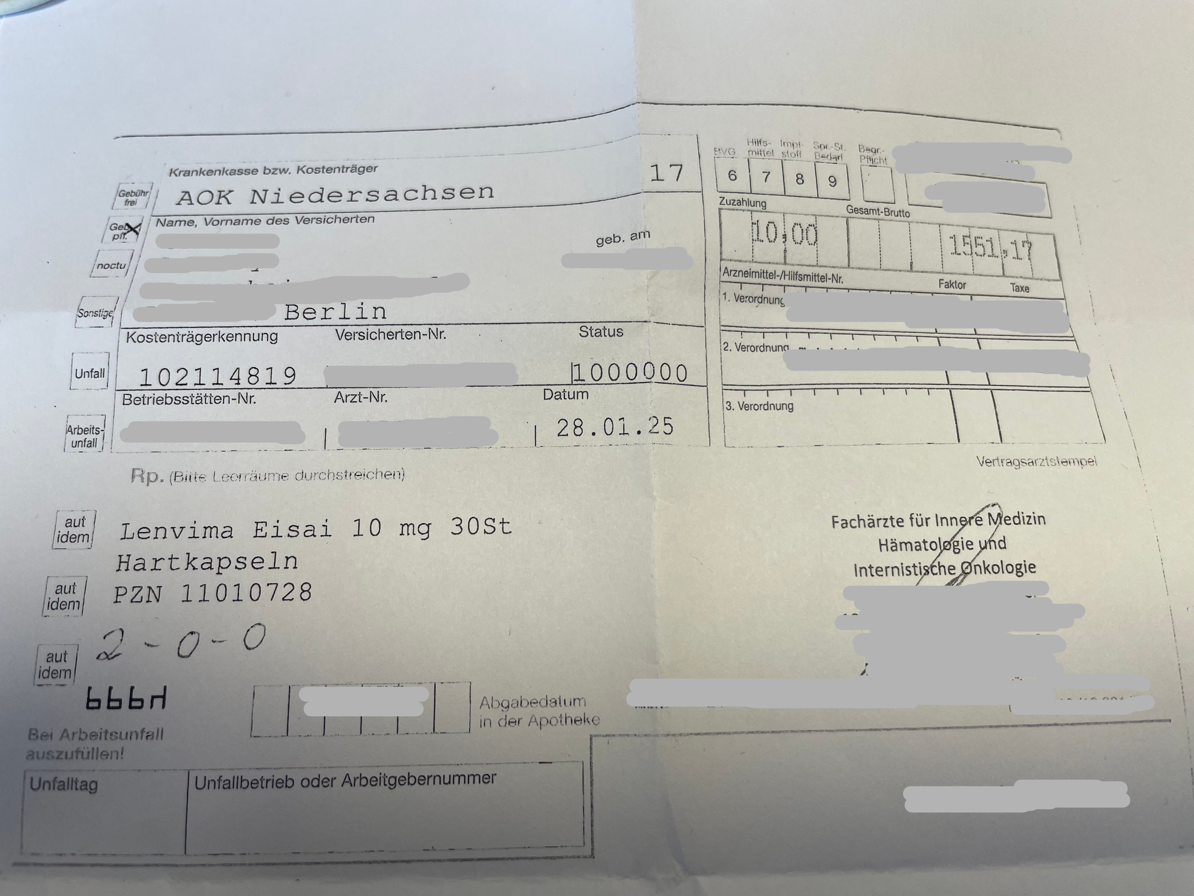 Rezeptfälschungen werden immer professioneller und sind kaum noch vom Original zu unterscheiden. So auch im Fall von Lenvima. Das Arzneimittel kommt bei differenziertem Schilddrüsenkarzinom, hepatozellulärem Karzinom und Endometriumkarzinom zum Einsatz. „Das Rezept ist als Fälschung zu erkennen, uns ist es trotzdem durchgerutscht. Das Lehrgeld muss ich zahlen. Ärgerlich ist aber, dass die Praxis hätte warnen können.“