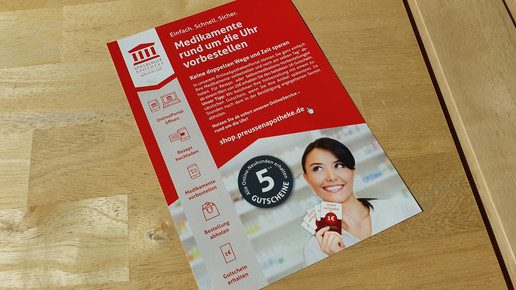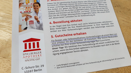 Auf einem aktuellen Flyer der Spielberger-Apotheke in Berlin-Spandau werden Gutscheine für die Vorbestellung von Arzneimitteln ausgelobt. Dabei wird auch die Fotoübermittlung von Rezepten entsprechend belohnt: „Für Rezept- oder Selbstmedikations-Vorbestellungen ab einem Wert von 25€ erhalten Sie den beliebten 1€-Gutschein.“ Wer seinen Artikel spätestens 24 Stunden nach dem von der Apotheke bestätigten Termin abholt, bekommt einen zusätzlichen Gutschein. Online-Neukunden erhalten sogar fünf Gutscheine.