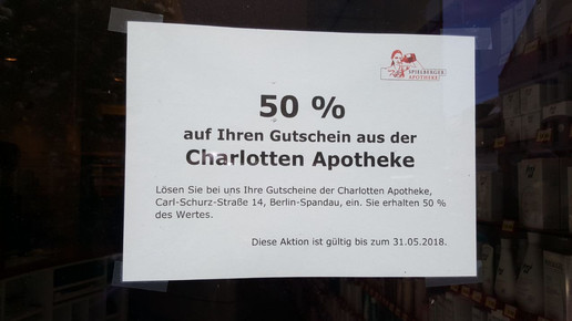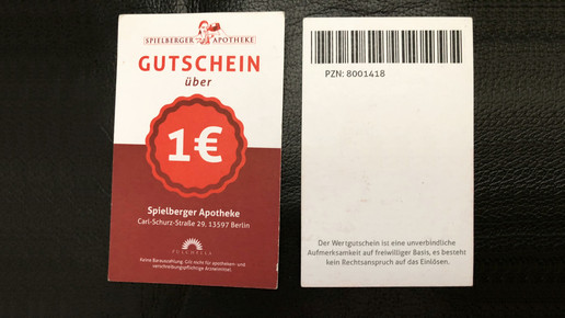 Die Wettbewerbszentrale bestätigt, dass es verschiedene Beschwerden zu den 1€-Gutscheinen gab und dass man die Sache notfalls gerichtlich prüfen werde. Zunächst wird aber selbstverständlich Stahn selbst gehört. Mit anderen Worten: In Spandau dürfte demnächst eine Abmahnung aus Bad Homburg in die Offizin flattern.