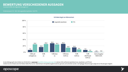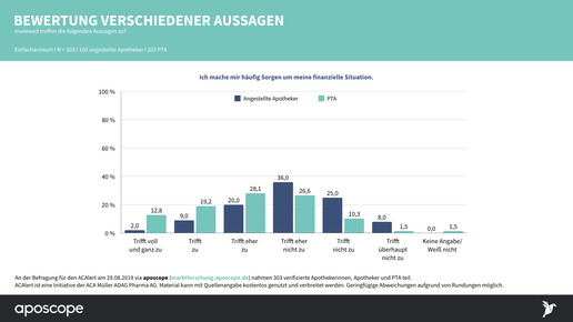 Eine deutliche Mehrheit von 67 Prozent der 303 befragten angestellten Apotheker und PTA gab an, Angst vor Altersarmut zu haben. Darunter sind 19 Prozent, die der Aussage voll zustimmen, unter den befragten PTA sogar 25 Prozent. Von ihnen haben der Aussage insgesamt 74 Prozent voll oder teilweise zugestimmt. Mit anderen Worten: Drei von vier PTA haben Angst vor Altersarmut – ein alarmierendes Ergebnis. Selbst unter Apothekern ist es noch die Hälfte. Zudem gaben 61 Prozent der PTA an, sich häufig Sorgen um ihre finanzielle Situation zu machen.