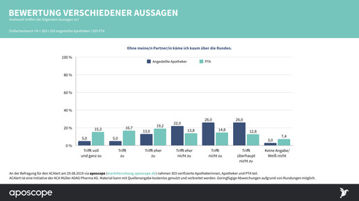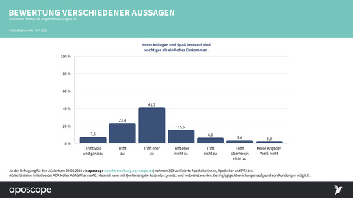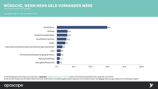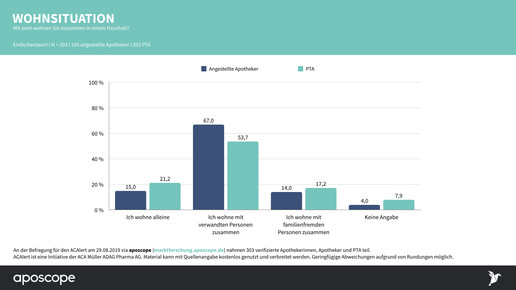 Allerdings geht aus der Umfrage auch hervor, dass es wichtigere Dinge gibt als das Gehalt: 72 Prozent der Befragten finden, dass nette Kollegen und Spaß im Beruf wichtiger sind als ein hohes Einkommen. Und wenn mehr Geld da wäre, würden die meisten gerne mehr verreisen oder shoppen. Jeder Zehnte würde auch gern in eine andere Wohnung oder Haus ziehen: Heute leben 17 Prozent der PTA und 14 Prozent der Apotheker mit familienfremden Personen zusammen, 21 beziehungsweise 15 Prozent alleine.