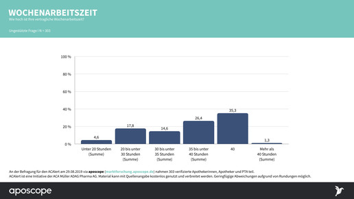 Wie ist es um die Arbeitsbedingungen der Teilnehmer im Einzelnen bestellt? Etwas mehr als ein Drittel hat eine 40-Stunden-Woche, ein weiteres Viertel arbeitet 35 bis 40 Stunden. Die Teilzeitverträge sind unter PTA weiter verbreitet als bei Apothekern. Überstunden bewegen sich bei den meisten in einem überschaubaren Rahmen mit Ausreißern nach oben, die 30 Überstunden und mehr angegeben haben.