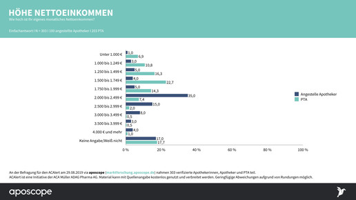 Konkret gaben 71 Prozent der PTA an, weniger als 2000 Euro netto im Monat zu verdienen. Bei den Apothekern liegen 40 Prozent zwischen 2000 und 3000 Euro netto – jeweils unbeachtet der Wochenarbeitszeit. Immerhin 17 Prozent der Befragten haben einen Nebenjob außerhalb der Apotheke. Jeder Vierte führt Haushaltsbuch.