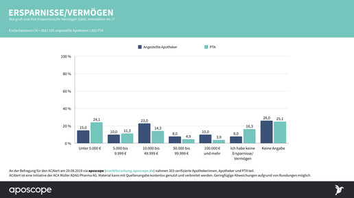 Zu den eigenen finanziellen Verhältnissen hat ein Viertel der Befragten keine Angaben machen wollen. 40 Prozent der PTA gaben an, gar keine Ersparnisse oder weniger als 5000 Euro zu haben. Bei den Apothekern sind es 23 Prozent. Allerdings gibt es in dieser Teilgruppe auch 10 Prozent, die mehr als 100.000 Euro auf der hohen Kante haben. Auf der anderen Seite hat insgesamt jeder dritte Befragte aktuell Schulden, PTA und Apotheker gleichermaßen. Jeder vierte Apotheker hat für sein Studium einen Kredit aufgenommen, 9,4 Prozent der PTA für ihre Ausbildung.