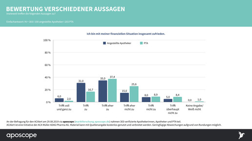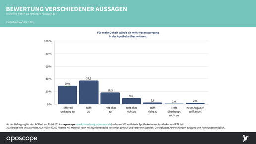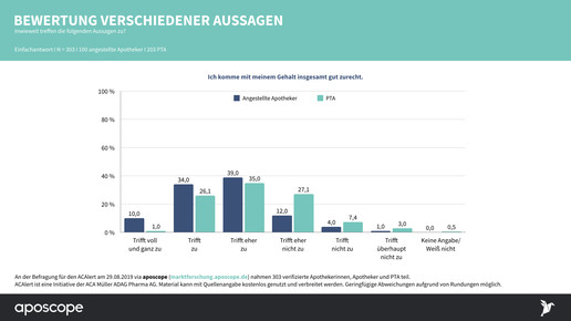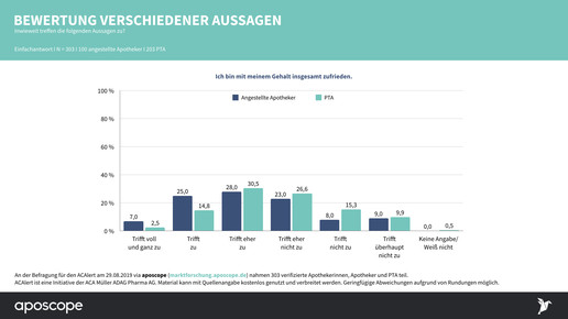 Trotzdem sagt eine Mehrheit, dass sie mit ihrem Gehalt insgesamt gut zurechtkommen. 83 Prozent der angestellten Apotheker und immerhin 62 Prozent der PTA stimmen dieser Aussage zu. Und 72 beziehungsweise 56 Prozent sind mit ihrer finanziellen Situation insgesamt zufrieden. Das heißt nicht, dass es nicht etwas mehr sein dürfte: 52 Prozent der PTA sind mit ihrem Gehalt nicht zufrieden, bei den Approbierten sind es 40 Prozent. Für mehr Gehalt würden 85 Prozent der Angestellten auch mehr Verantwortung übernehmen.