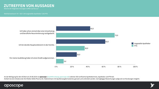 In 36 Prozent der Fälle ist der oder die PTA Hauptverdiener in der Familie. Bei vielen reicht das eigene Gehalt nicht aus. Die Hälfte stimmte der Aussage zu: „Ohne meine/n Partner/in käme ich kaum über die Runden.“ Bei den Apothekern sind es 23 Prozent. Knapp drei Viertel der PTA haben schon einmal über eine Umschulung oder berufliche Neuorientierung nachgedacht. Selbst unter den befragten Apothekern sind es 43 Prozent.