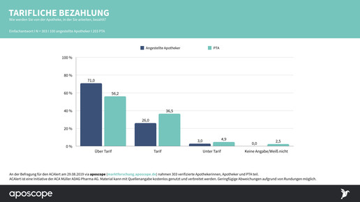 Aufgrund des Fachkräftemangels müssen Inhaber heute regelmäßig über Tarif bezahlen, um überhaupt Mitarbeiter zu finden. Unter den Approbierten gaben 71 Prozent an, über Tarif zu verdienen, weitere 26 Prozent bekommen das tariflich vereinbarte Gehalt, 3 Prozent weniger. Bei den PTA sieht es nicht ganz so gut aus: Zwar verdienen auch 56 Prozent über Tarif, aber 37 Prozent wie von der Gewerkschaft Adexa ausgehandelt und immerhin 4,9 Prozent weniger.