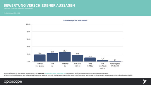 Unter Apothekern und PTA herrscht quasi Vollbeschäftigung. Vor Arbeitslosigkeit müssen sich diese Berufsgruppen nicht fürchten. Trotzdem haben zwei Drittel der Angestellten in Apotheken mit Blick auf ihre finanzielle Situation Angst vor Altersarmut. Das ist das ernüchternde Ergebnis einer Umfrage der Reihe ACAlert im Auftrag von ACA Müller ADAG Pharma AG.
