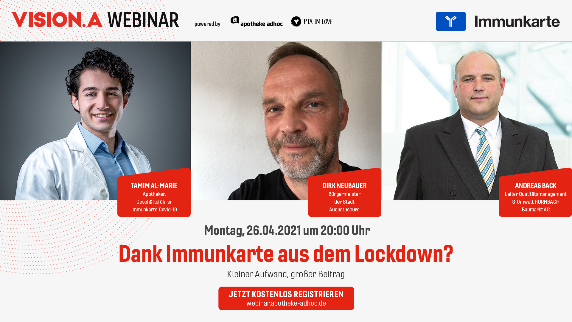 Apotheken sollen die Immunkarte Covid-19 künftig im Handumdrehen selbst ausstellen können. Damit leisten sie nicht nur einen Beitrag zur Überwindung der Pandemie, sondern können sich auch weiter als niedrigschwellige Anlaufstation profilieren. Doch wie funktioniert das und welche Perspektive hat das Modell? Das erklärt Start-up-Gründer Tamim Al-Marie gemeinsam mit zwei Gästen am Montagabend bei VISION.A Webinar, dem kostenlosen Streamingangebot, powered by APOTHEKE ADHOC und PTA IN LOVE.