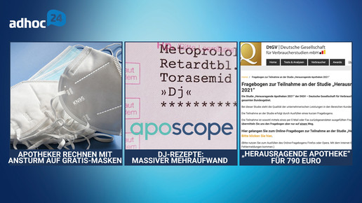 Ab morgen gibt es Gratis-Masken in 140 Apotheken in Bremen und Bremerhaven – die Apothekeninhaber rechnen mit einem großen Ansturm. Eine aposcope-Umfrage zeigt auf, dass die neu eingeführten Dj-Verordnungen für einen massiven Mehraufwand in den Apotheken sorgen. Lebensmittel zur bilanzierten Diät sollen fortan in den Regelleistungskatalog der Krankenkassen aufgenommen werden. Und für 790 Euro können sich Apotheken als „herausragend“ betiteln lassen. Diese und weitere wichtige Meldungen des Tages bei adhoc24.