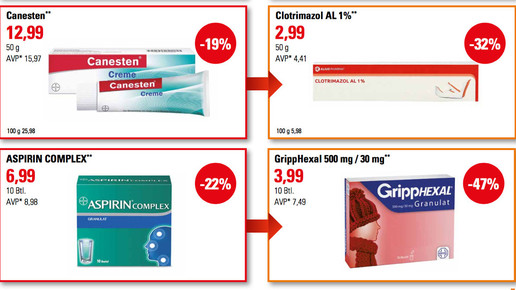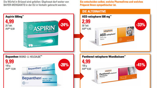 Das sind einige Antworten der Ried + Apotheken auf den Bayer-Monsanto-Deal: ASS ratiopharm 500 mg statt Aspirin, Panthenol Wundbalsam statt Bepanthen, Simeticon statt Lefax, Clotrimazol Al statt Canesten und Gripphexal statt Aspirin Complex.