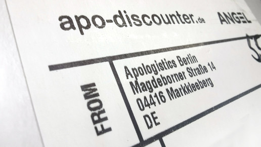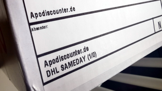 Wir schauen uns in Ruhe die Sendung an. Absender ist „Apologistics Berlin“ mit Sitz in Markkleeberg, das ist die Firma, die auf der Logistikseite hinter Apo-Discounter steht. Auf der Rechnung taucht dann die Apotheke im Praunsdorf Center auf, allerdings ebenfalls mit Adresse in Markkleeberg. Auf einem Etikett taucht noch der Hinweis „DHL Sameday (1/0)“ auf – vermutlich hat der Logistikkonzern die Sendung abgeholt und nach Berlin gebracht, wo sie dann an den Spediteur übergeben wurde.